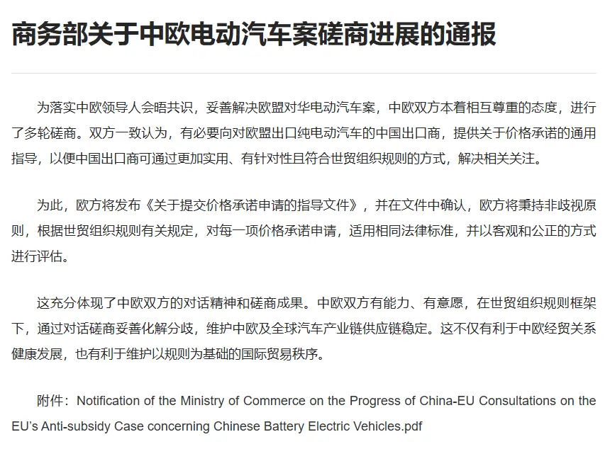 商务部本日发布对于中欧电动汽车案连系发挥的通报: