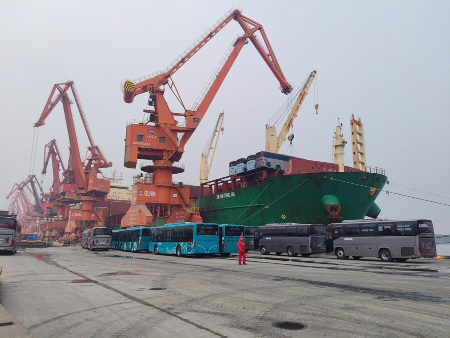 今天上昼,在龙吴船埠,大型散杂货船“新海通XX”轮装载299辆苏州金龙海格客车,在闵行海事部门的安全监管与工作保险下凯旋完成装载,驶往共建“一带沿路”进犯口岸阿尔及利亚阿尔及尔港——这是上海黄浦江水域2026年首单国产汽车批量出口业务。